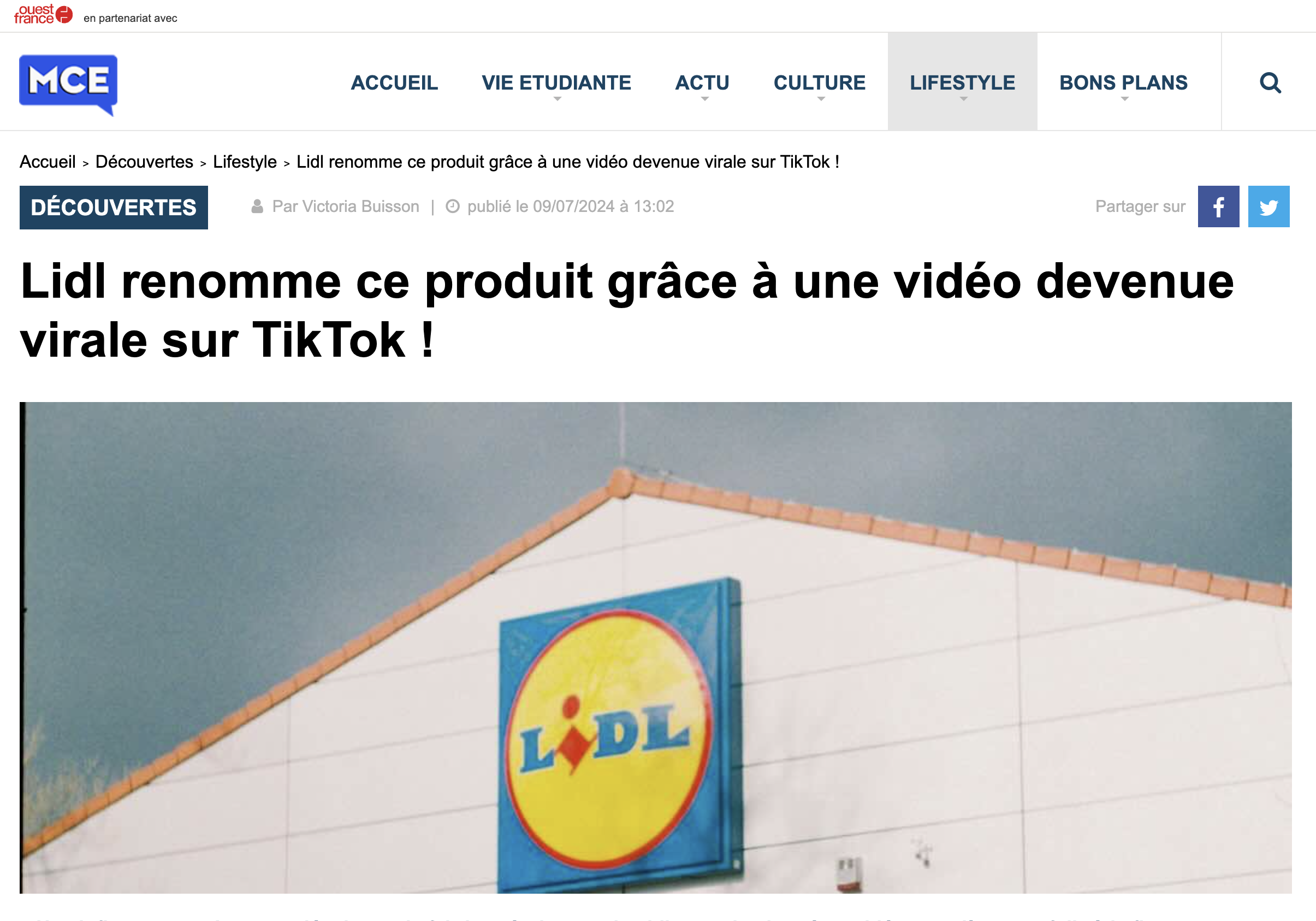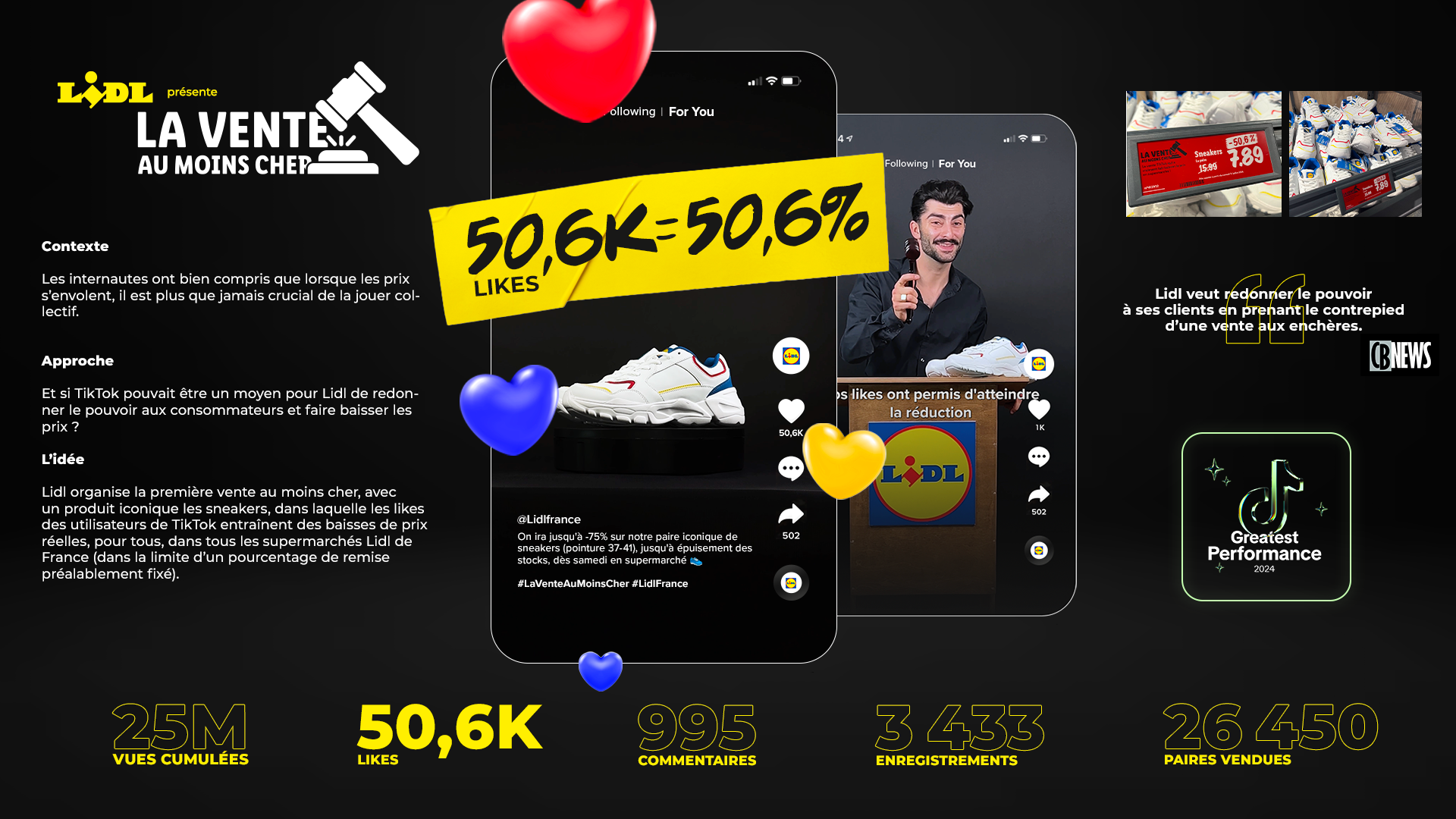 Lidl organise la première vente au moins cher, avec un produit iconique, les sneakers, dans laquelle les likes des utilisateurs de TikTok entraînent des baisses de prix réelles, pour tous, dans tous les supermarchés Lidl de France.